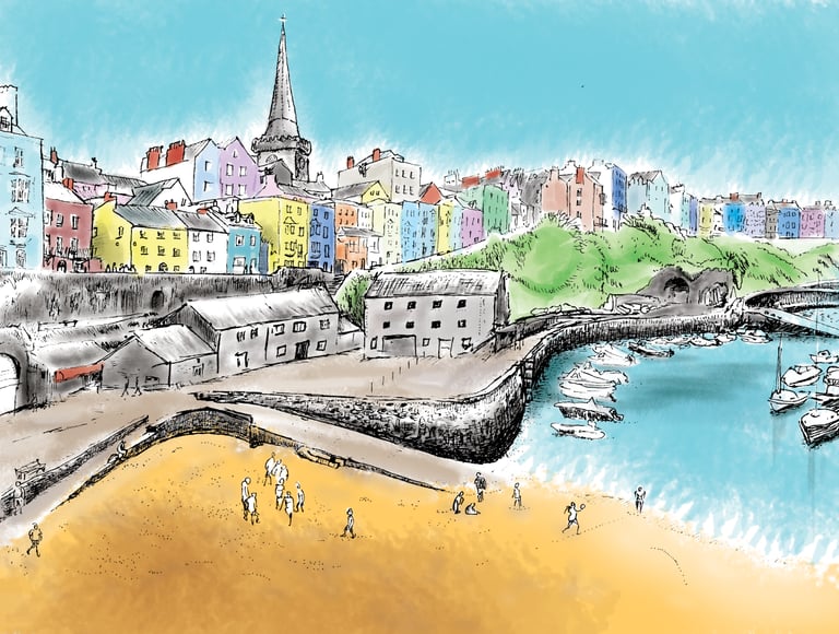 Nestled on the stunning Pembrokeshire coast, Tenby is a timeless jewel of Wales, nicely captured in my featured sketch. This enchanting harbour town is a vibrant tapestry of colour and history, renowned for its iconic row of pastel-painted Georgian houses overlooking a sheltered bay. Its ancient, cobbled streets are enclosed within well-preserved medieval walls, whispering tales of a rich past.